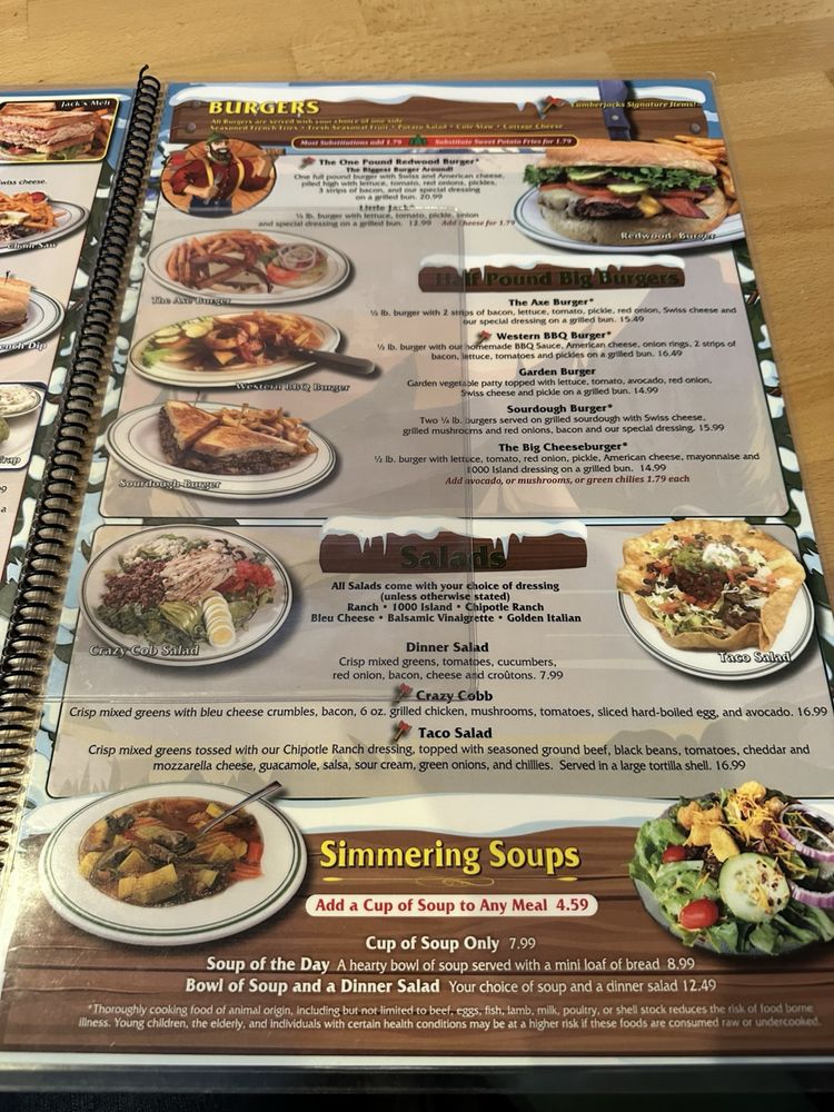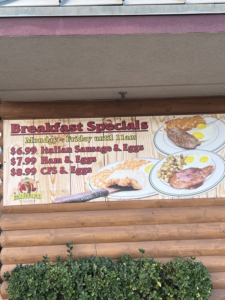 “ My family and I decided to enjoy and nice quiet evening here on a Thursday around 6pm. We had 10 in our group. It was very slow,therefore we were greeted easily and taken care of with no major issue. The only reason I gave 4 star is due to the lack of seating for a larger group and the mix up of how we wanted our burgers cooked. There were two main tables in the middle of the restaurant, we would have liked to sit face to face at the same table. Understanding that not all restaurants are available to do so. However we made it work! The service was very caring, and really quick. We ordered,and I don't even think it took 15 min for all 10 of us to receive our food. Half the table got western burgers, which were amazing . And other half got breakfast foods. Aside from some of us receiving the wrong temperature of burger this food was satisfying. Infact I quoted I'll take this over dennys and ihop any-day. Pancakes were huge, bigger than my face! Fries and potatoes are cooked/seasoned well. Some of the employees were even curious to ask about our family. And I enjoy when people actually express themselves or are curious enough to ask questions! To be engaged is the absolute thing to do when there is time to do so. So thanks Lumberjacks! You guys did an awesome job. ”
